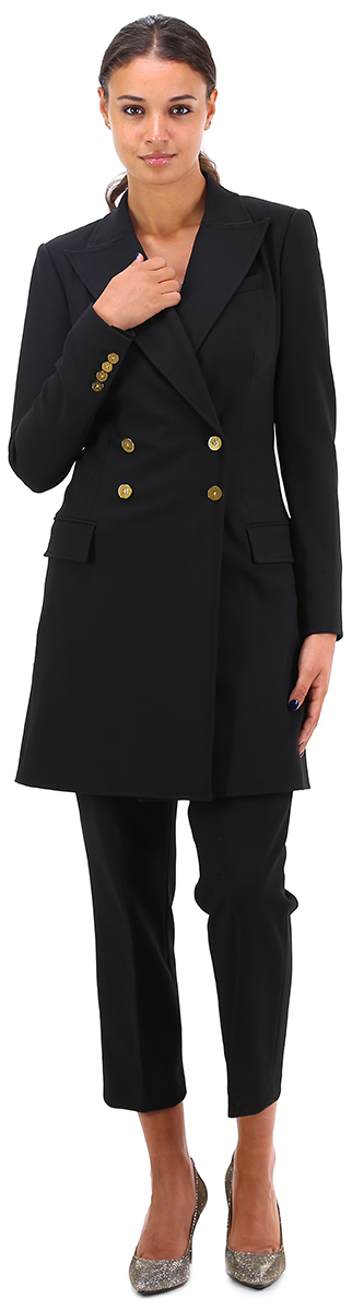 Giacca lunga foderata in misto viscosa, maniche lunghe e collo a lancia. Tasche a pattina e bottoni di chiusura gold a doppio petto. La modella è alta 1.80 ed indossa la taglia XS.