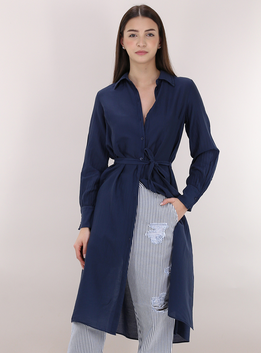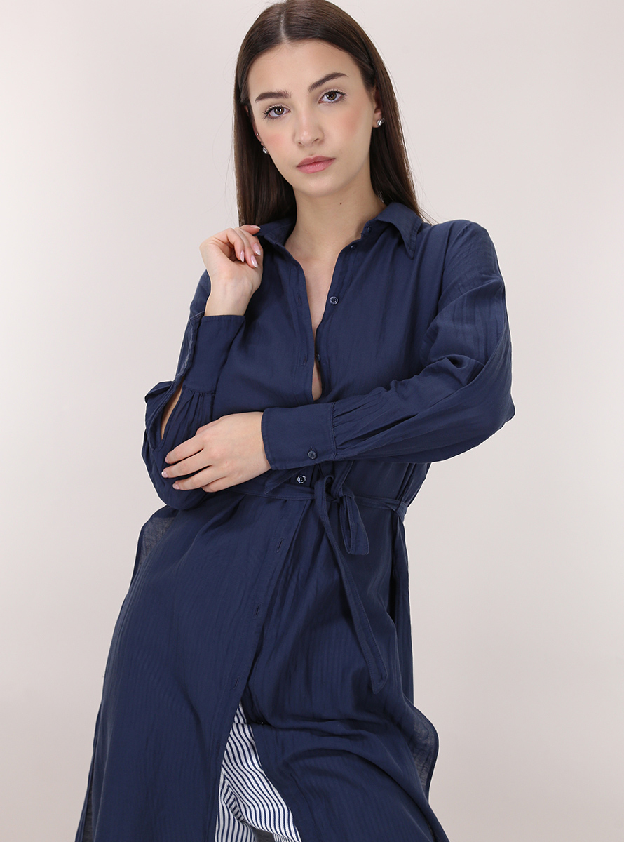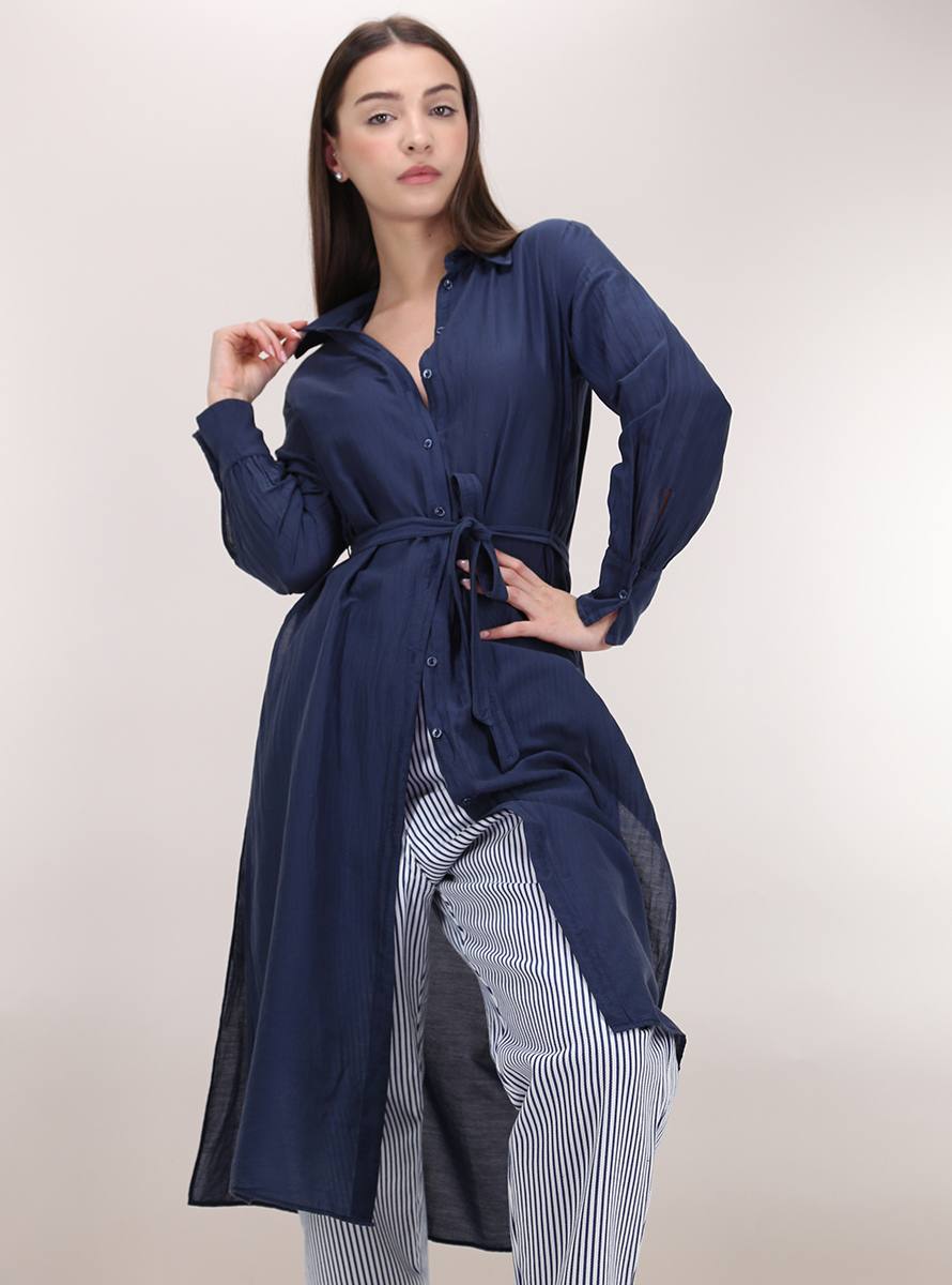 Camicia Tandem in organza di cotone e seta a maniche lunghe e collo classico. Spacchi laterali sul fondo e cintura in tessuto inclusa. La modella è alto 1.70 ed indossa la taglia 42.