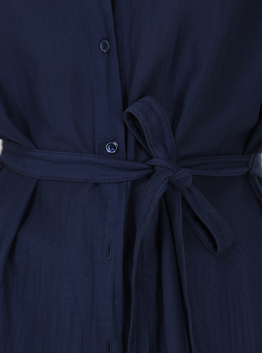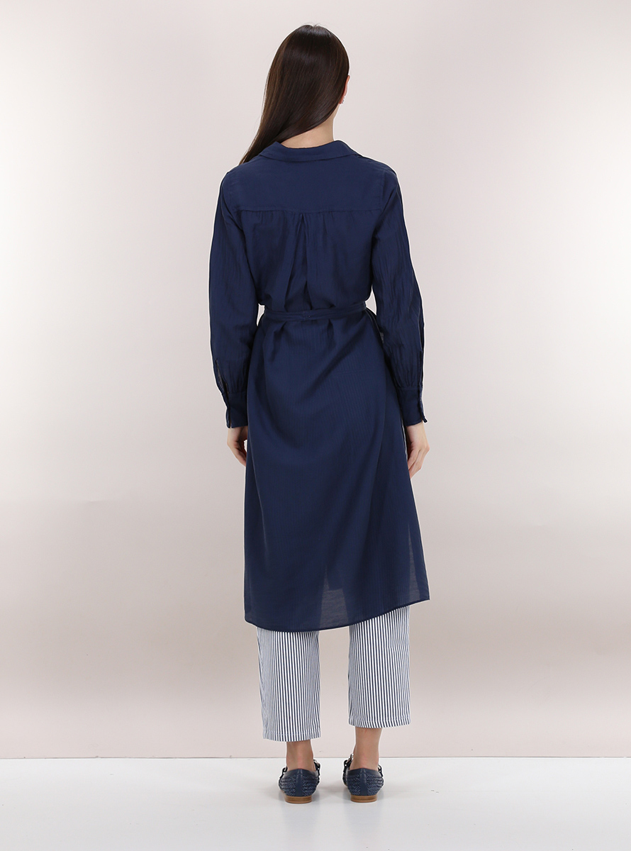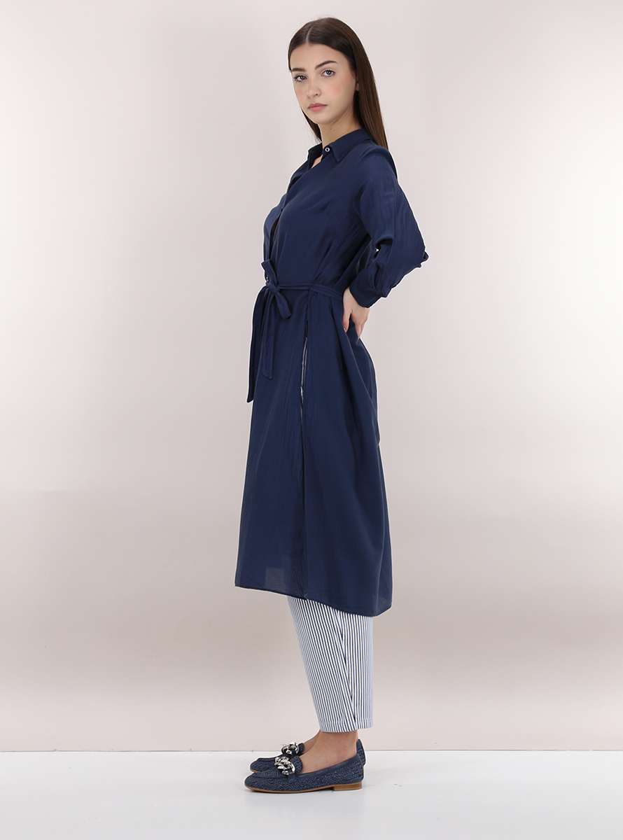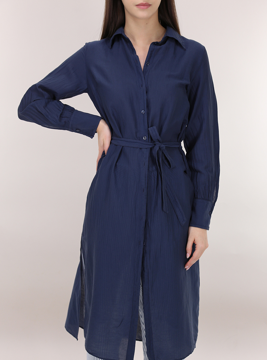 Camicia Tandem in organza di cotone e seta a maniche lunghe e collo classico. Spacchi laterali sul fondo e cintura in tessuto inclusa. La modella è alto 1.70 ed indossa la taglia 42.
