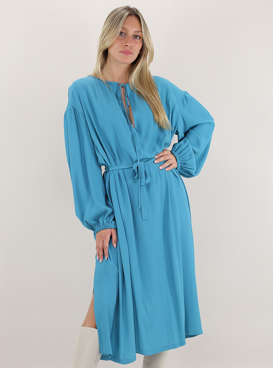 Abito morbido Semicouture in misto seta. Maniche lunghe con elastico sul fondo e collo a giro arricciato con fiocchetto di chiusura a goccia frontale. Spacchi sul fondo e cintura in tessuto inclusa. La modella è alta 1.70 e indossa la taglia 40.