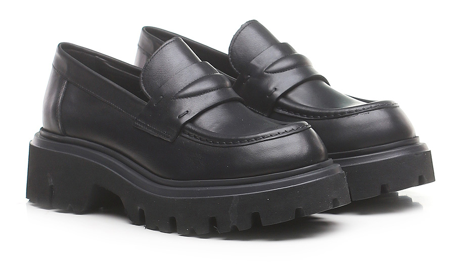 Scarpa in pelle con suola in gomma. Altezza tacco 50mm, platform 35mm con battuta 15mm.