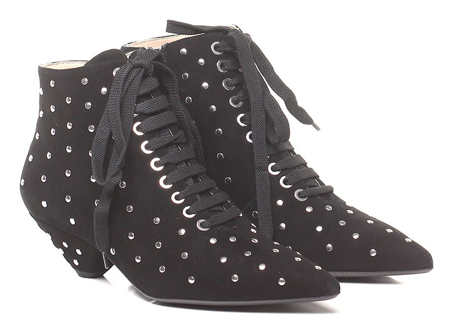 Tronchetto in camoscio con zip su lato interno e borchie su tomaia. Suola in gomma, tacco 95.