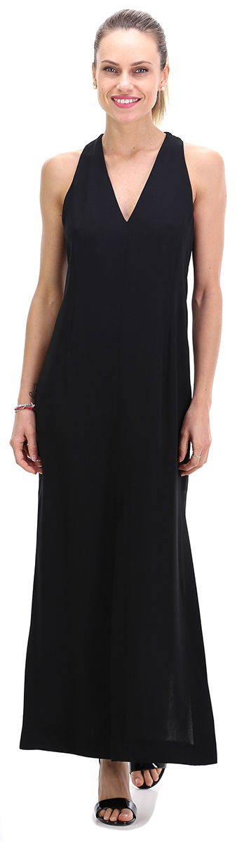 Abito morbido smanicato con spacchi sul fondo. Collo a V e zip di chiusura sul lato. La modella è alta 1.68 ed indossa la taglia 40.