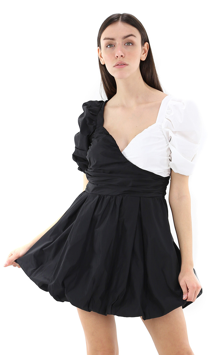 Abito in tafetà bicolor foderato. Maniche corte a sbuffo e scollo incrociato fronte e retro. Gonna a palloncino e zip di chiusura laterale. La modella è alta 1.78 ed indossa la taglia 40.