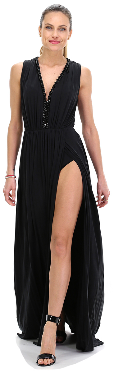 Abito lungo in cupro con body applicato. Gonna arricciata in vita con spacco sovrapposto laterale. Collo a V profondo con catena logata applicata e apertura sul retro. La modella è alta 1.68 ed indossa la taglia 40.
