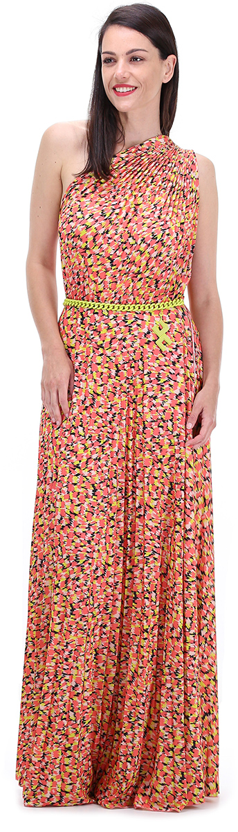Abito monospalla plissettato con spacco profondo su fianco. Catena applicata in vita con logo e zip di chiusura laterale. Fantasia multicolor. La modella è alta 1.75 ed indossa la taglia 42.