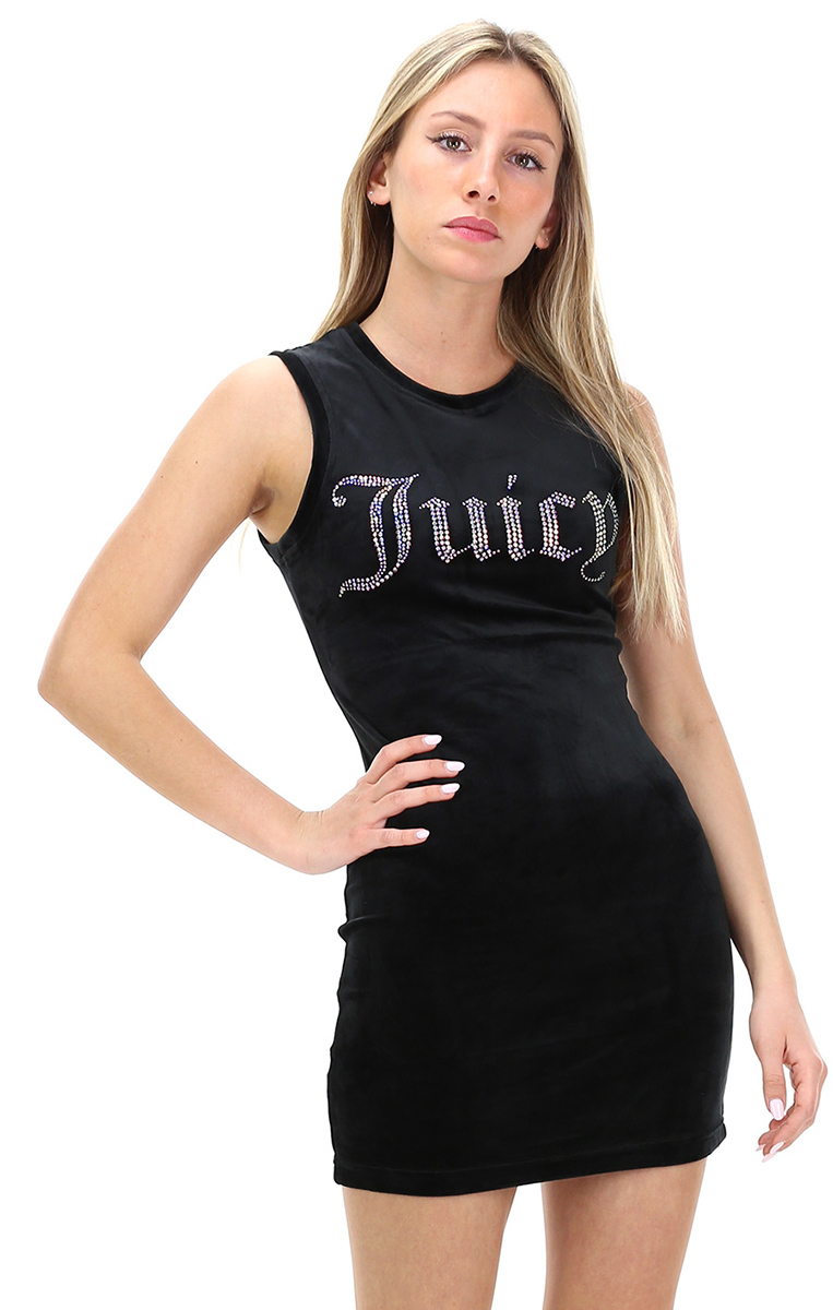 Abito stretch Juicy Couture in ciniglia con collo a giro. Logo in strass multicolor frontale. La modella è alta 1,70 ed indossa la taglia S.
