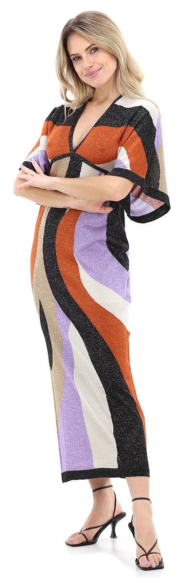 Abito kimono semifoderato in misto viscosa a maniche corte e scollo a V fronte e retro. Laccio di chiusura sul retro. Fantasia multicolor con lurex. La modella è alta 1,68 cm ed indossa la taglia XS.