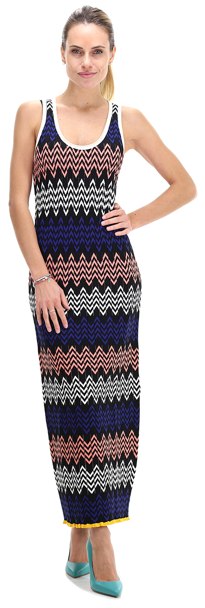 Abito lungo in misto viscosa con corpetto a canotta. Fantasia a zig zag multicolor. La modella è alta 1.68 ed indossa la taglia 40.