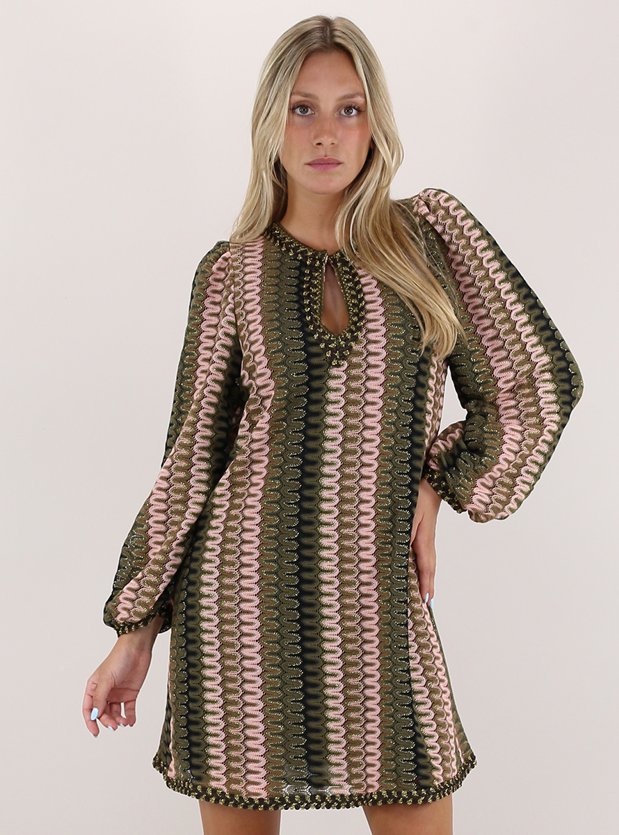 Abito morbido Pho Firenze in misto cotone foderato. Maniche lunghe ampie e scollo a giro con goccia. Passamaneria su bordi. Fantasia zig zag multicolor con lurex. La modella è alta 1.70 ed indossa la taglia S.