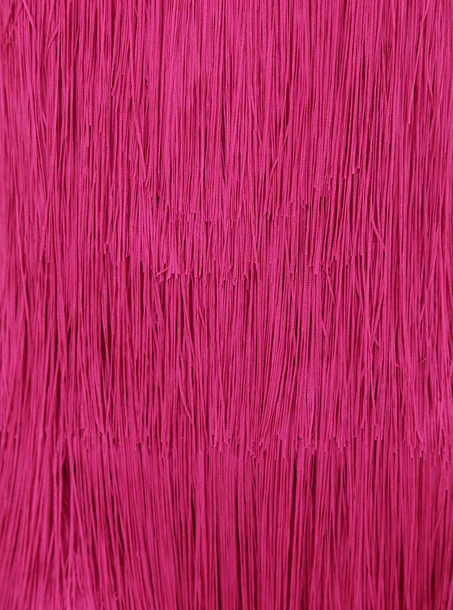 Abito Pinko a frange foderato. Maniche all'americana e scollo a giro con bottone di chiusura. Scollo profondo sul retro con spalline. La modella è alta 1.68 ed indossa la taglia 40.