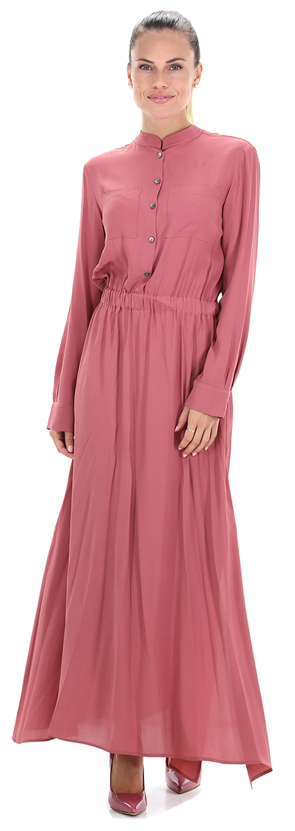 Abito lungo in misto seta a maniche lunghe e collo a fascetta. Spacco sul fondo ed elastico in vita. La modella è alta 1.68 ed indossa la taglia 40.