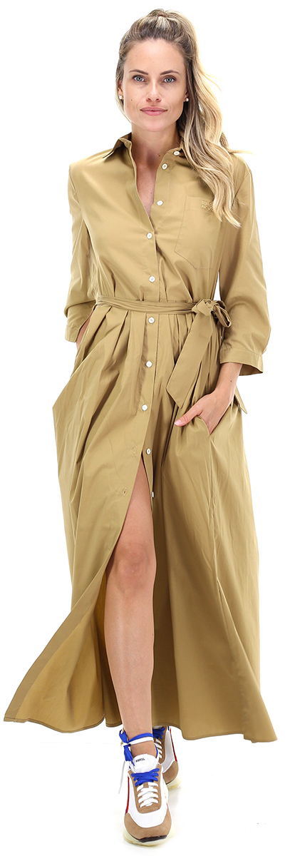 Abito chemisier in cotone stretch con maniche a tre quarti e collo classico. Tasca a toppa frontale con logo ricamato e a sacchetto sui fianchi. Bottoni di chiusura e cintura in tessuto inclusa. La modella è alta 1,68 ed indossa la taglia 42.