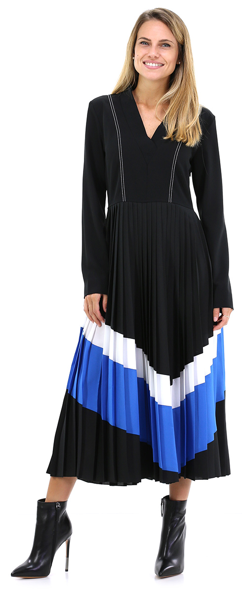 Abito con gonna a pieghe multicolour, corpetto a maniche lunghe, collo a V con polsino e cuciture a vista a contrasto. Zip di chiusura su fianco. La modella è alta 1.68 ed indossa la taglia 40.