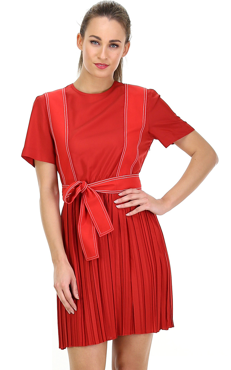 Abito in misto cotone e viscosa con gonna plissettata. Maniche corte e collo a giro. Cuciture a contrasto e cintura in tessuto inclusa. Zip di chiusura sul fianco. La modella è alta 1.80 ed indossa la taglia 42.