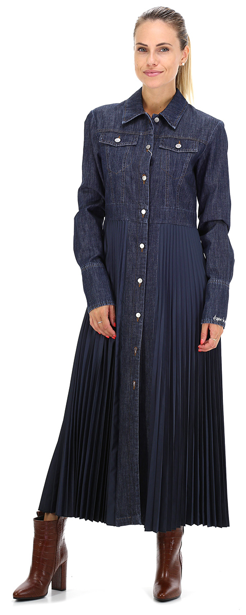 Abito in jeans con inserti plissettati a maniche lunghe e collo classico. Automatici di chiusura frontali in metallo. La modella è alta 1.68 ed indossa la taglia 40.