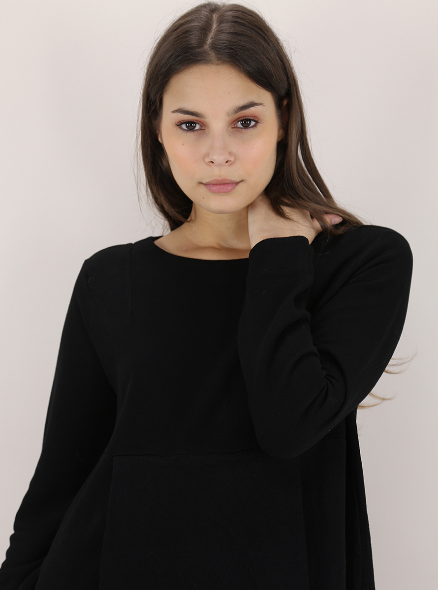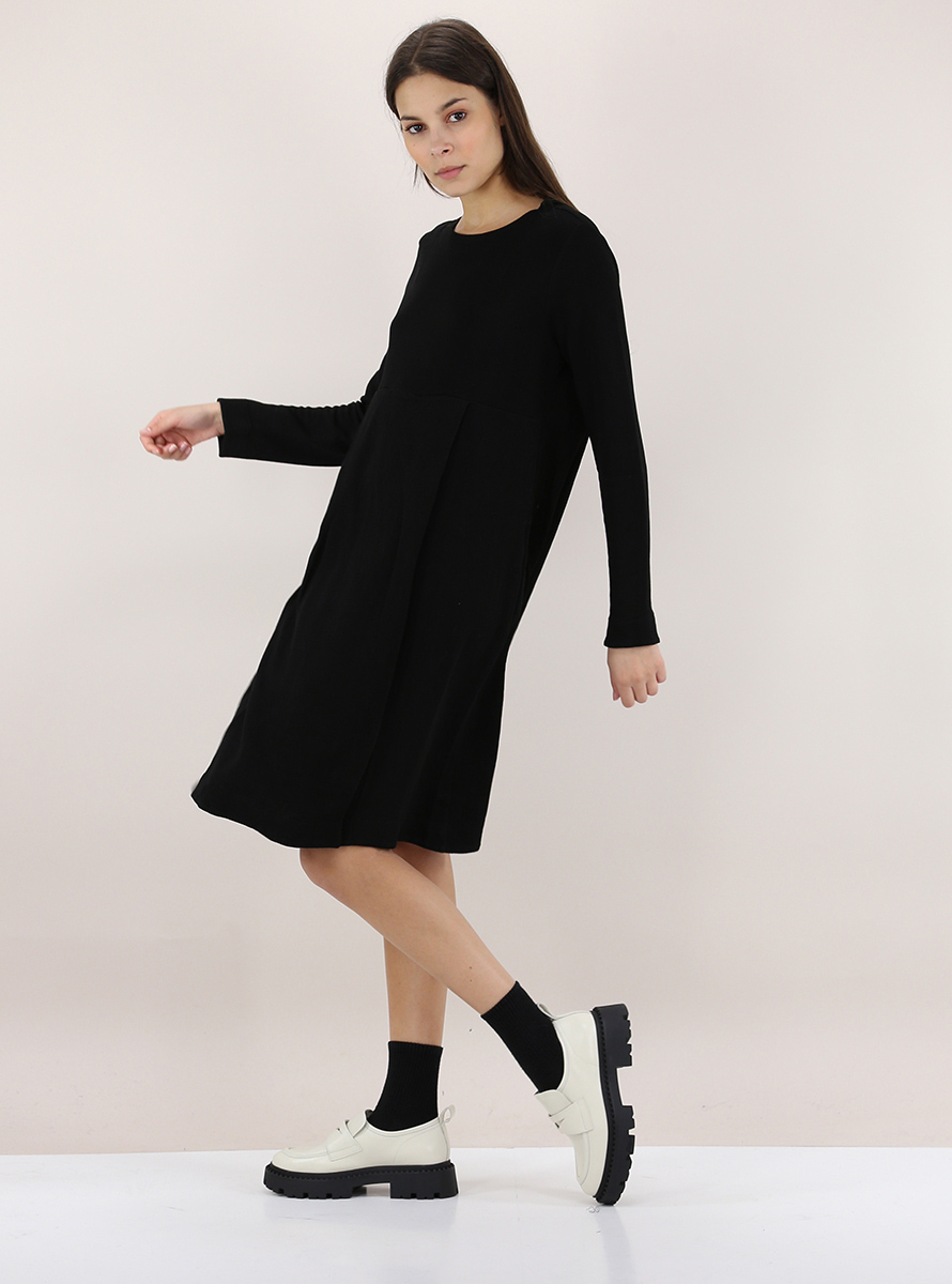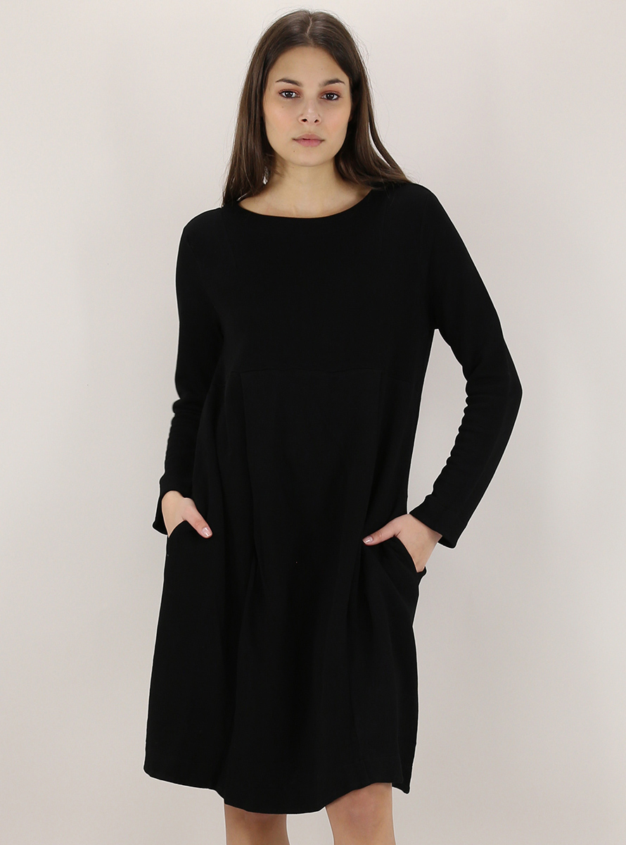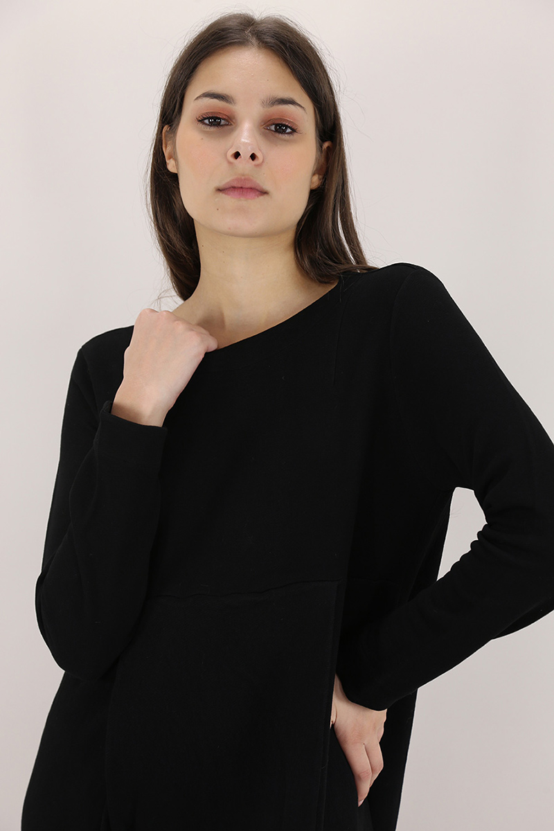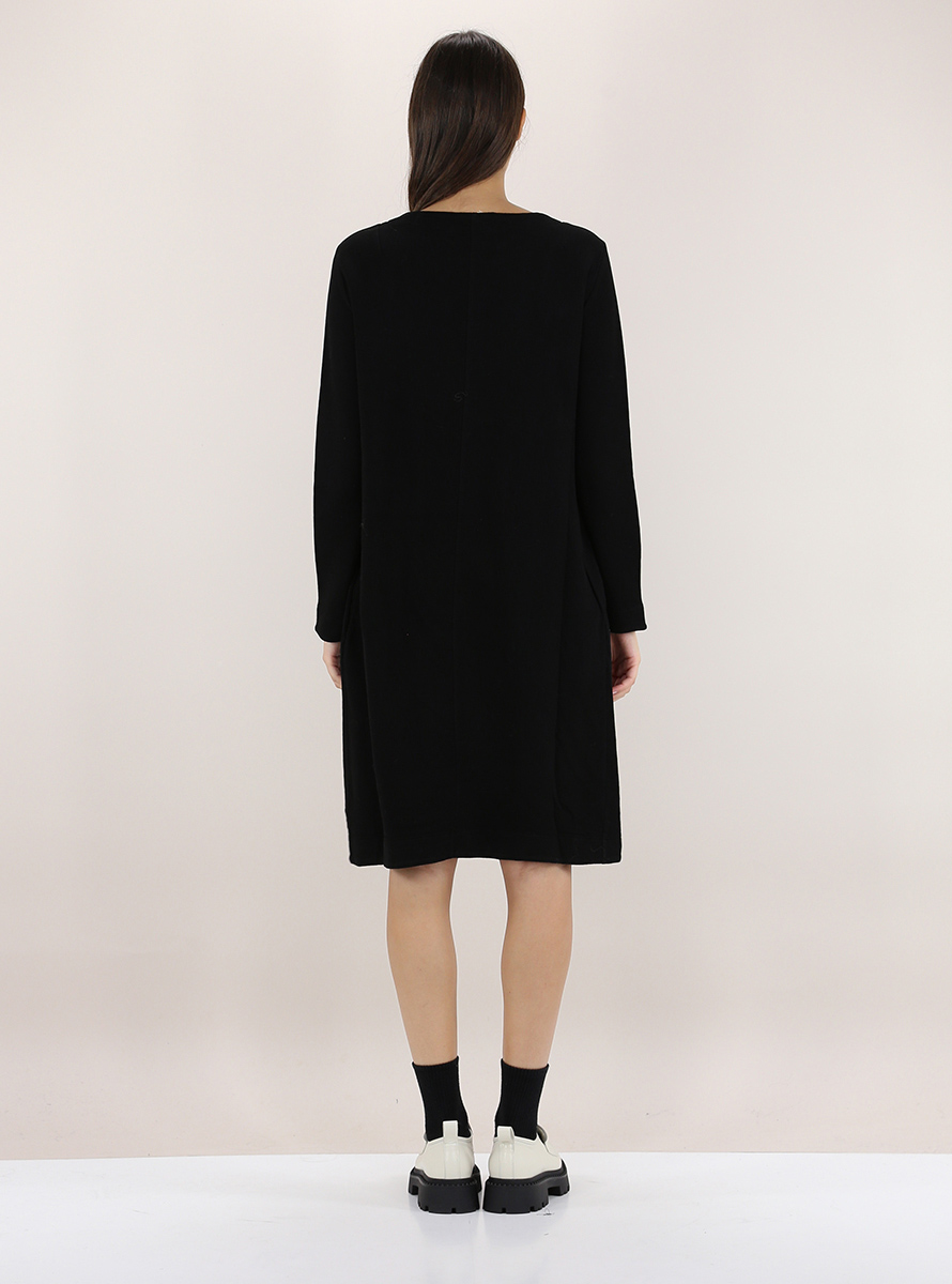Abito morbido Tandem in lyocell, viscosa, cachemire, seta e cotone. Maniche lunghe e collo a giro. Tasche a sacchetto laterali. La modella è alta 1,75 e indossa la taglia 40.