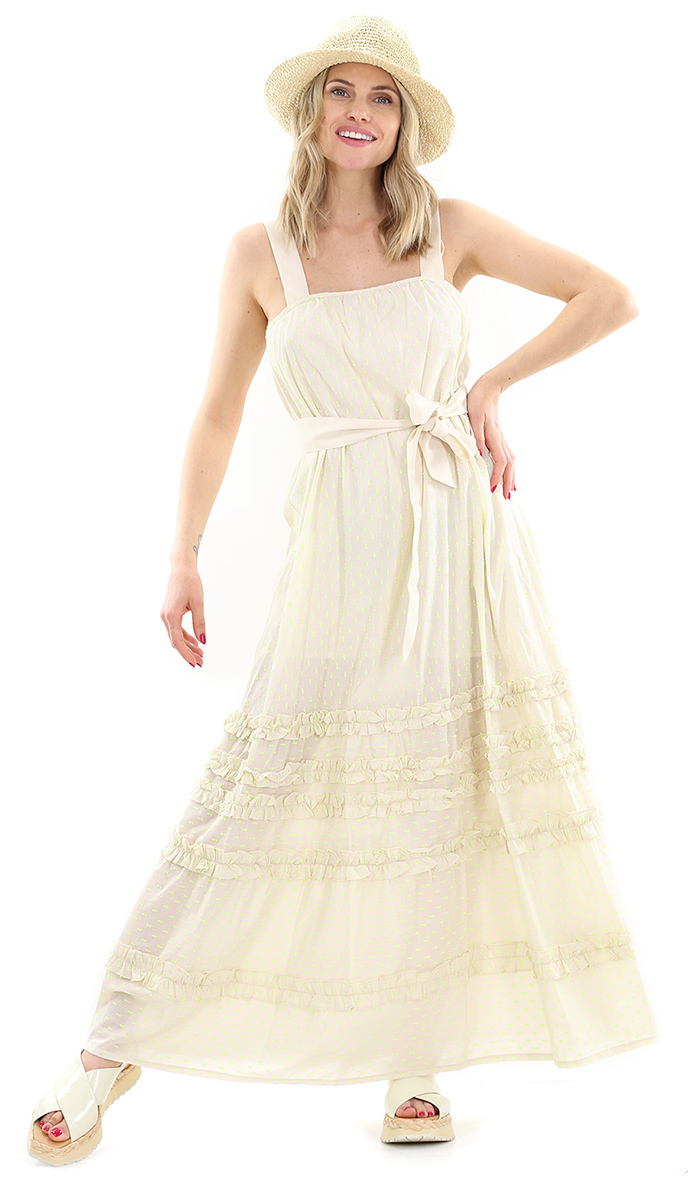 Abito Twin Set Actitude in cotone con spalline larghe e rouges applicate sul fondo. Sottoveste e cintura in tessuto incluse. Fantasia plumetis fluo. La modella è alta 1,68 ed indossa la taglia S.