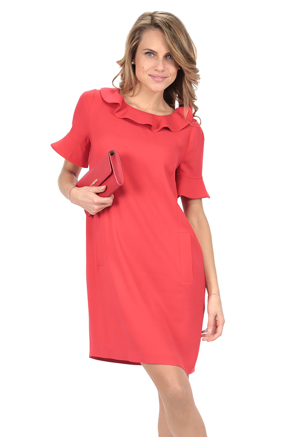 Abito in viscosa a manica corta con balze sullo scollo e sulle maniche. Tasche frontali.
