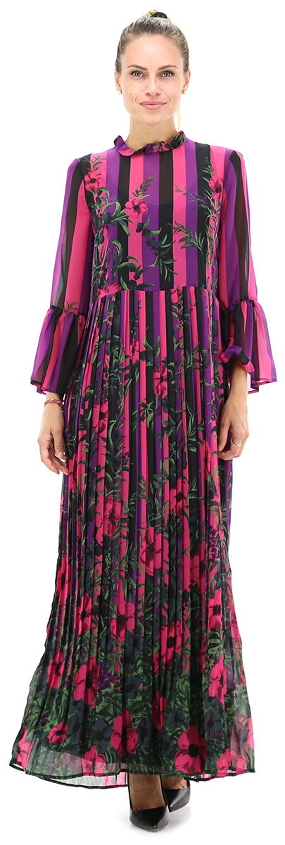 Abito lungo con gonna a pieghe, maniche a tre quarti ampie e collo a giro con roches. Bottoni di chiusura sul retro e sottoveste inclusa. La modella è alta 1,68 e indossa la taglia 42.