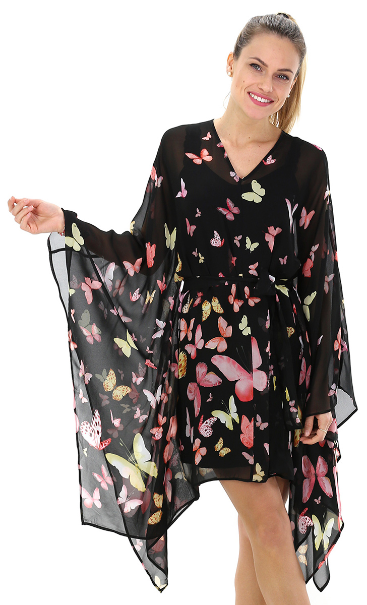 Abito kaftano in viscosa con collo a V. Cintura in tessuto e sottoveste incluse. La modella è alta 1.68 ed indossa la taglia 40.