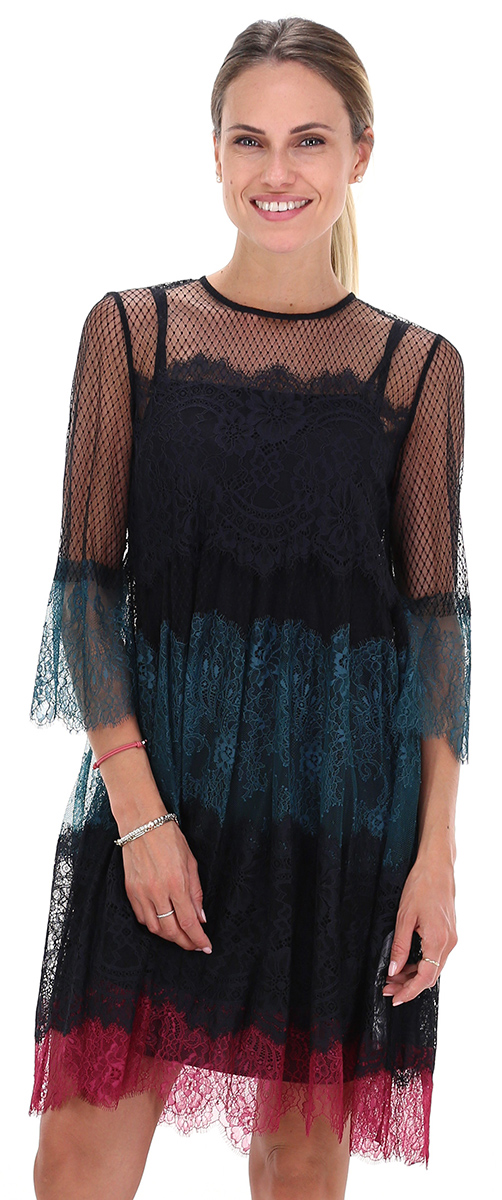 Abito in tulle con balze in pizzo multicolor. Maniche a tre quarti e collo a giro con bottone di chiusura a goccia sul retro. Sottoveste inclusa. La modella è alta 1.68 ed indossa la taglia 40.