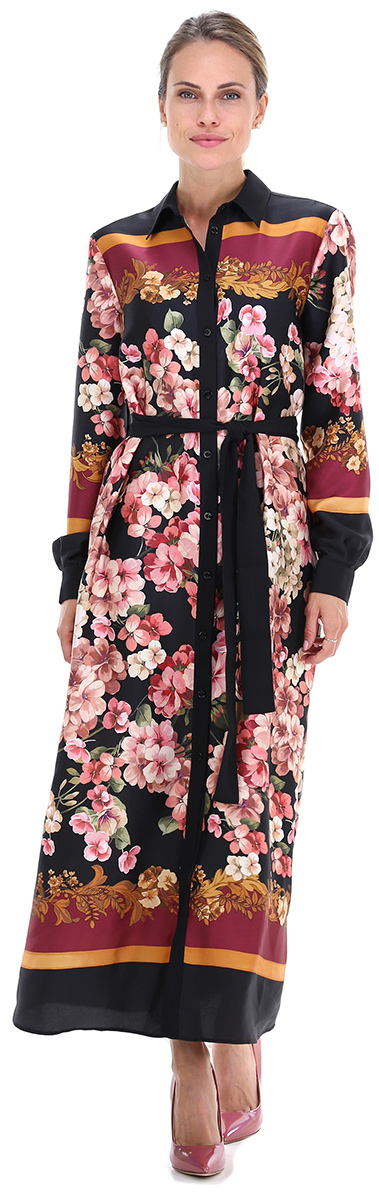 Abito svasato a maniche lunghe e collo classico. Bottoni di chiusura frontali e cintura in tessuto inclusa. Fantasia floreale. La modella è alta 1.68 ed indossa la taglia 40.