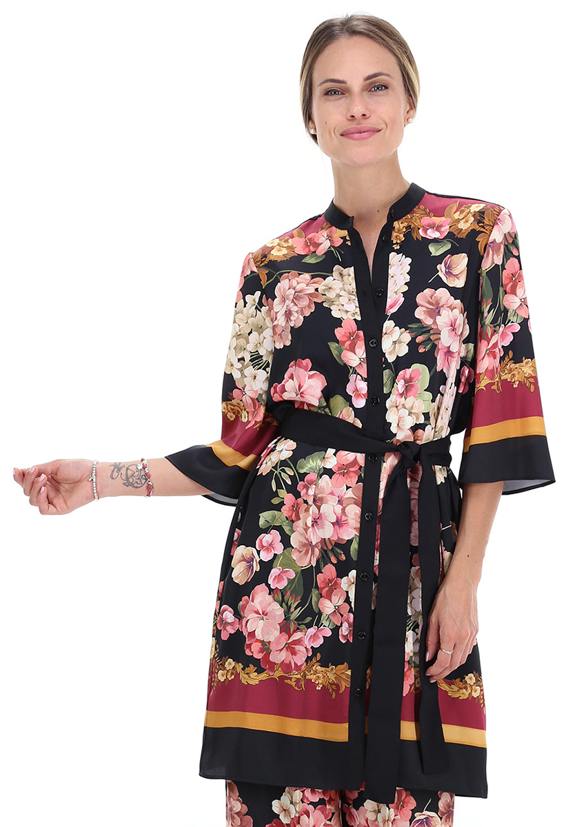 Abito morbido con maniche a tre quarti e collo a fascetta. Bottoni di chiusura frontali e cintura in tessuto inclusa. Fantasia floreale. La modella è alta 1.68 ed indossa la taglia 40.