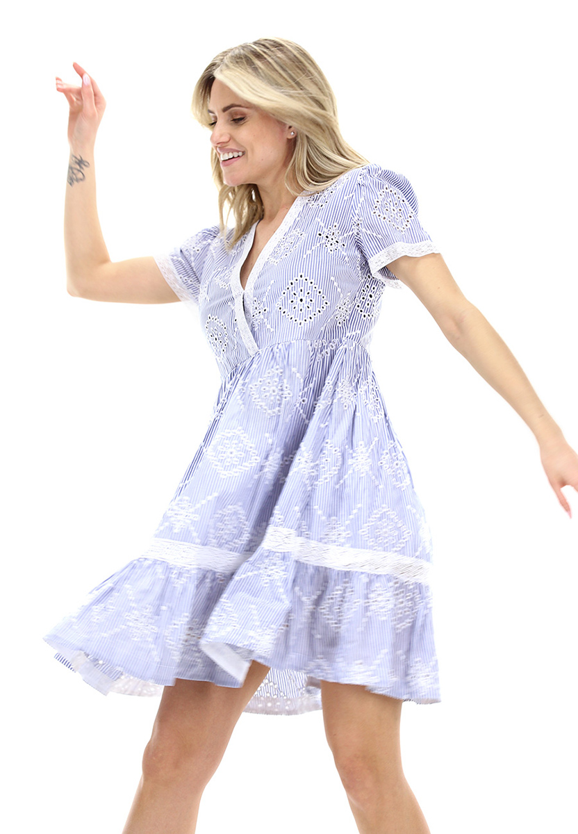 Abito TwinSet in sangallo di cotone foderato. Maniche corte e scollo a V incrociato frontale. Applicazioni in pizzo sui bordi. Fantasia a righe. La modella è alta 1.68 ed indossa la taglia 38.