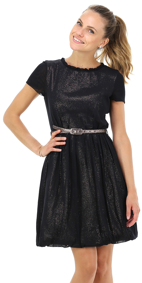 Abito a palloncino effetto glitter. Manica corta in tulle e cintura glitterata inclusa. La modella è alta 1.68 ed indossa la taglia 40.