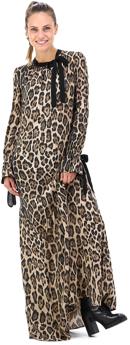 Abito lungo in viscosa, maniche lunghe, collo a giro asimmetrico con chiusura a fiocco. Fantasia animalier. La modella è alta 1.68 ed indossa la taglia 40.