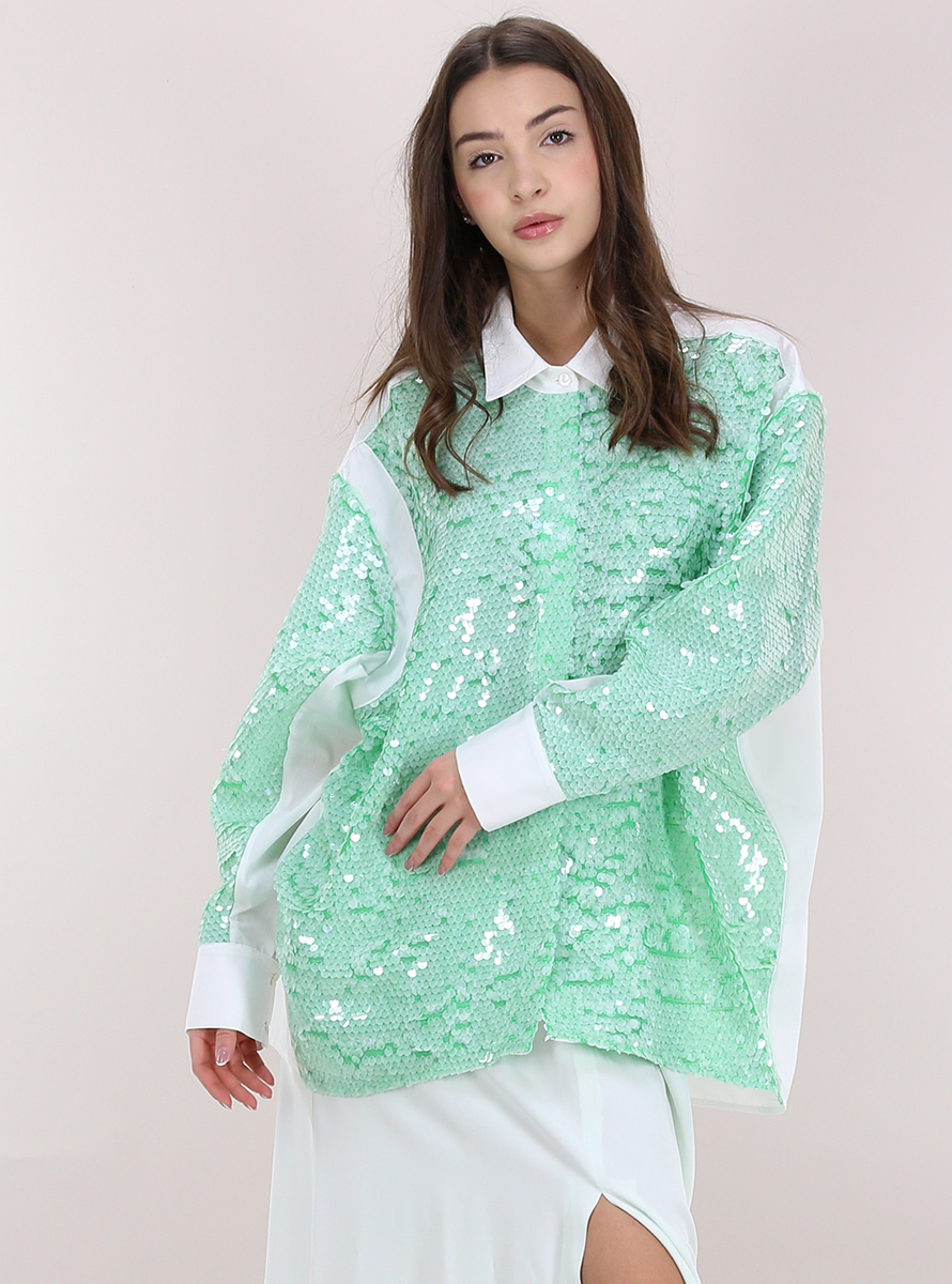 Camicia oversize Aviù in cotone e pailettes. Maniche lunghe e collo classico. La modella è alta 1.70 ed indossa la taglia 40.