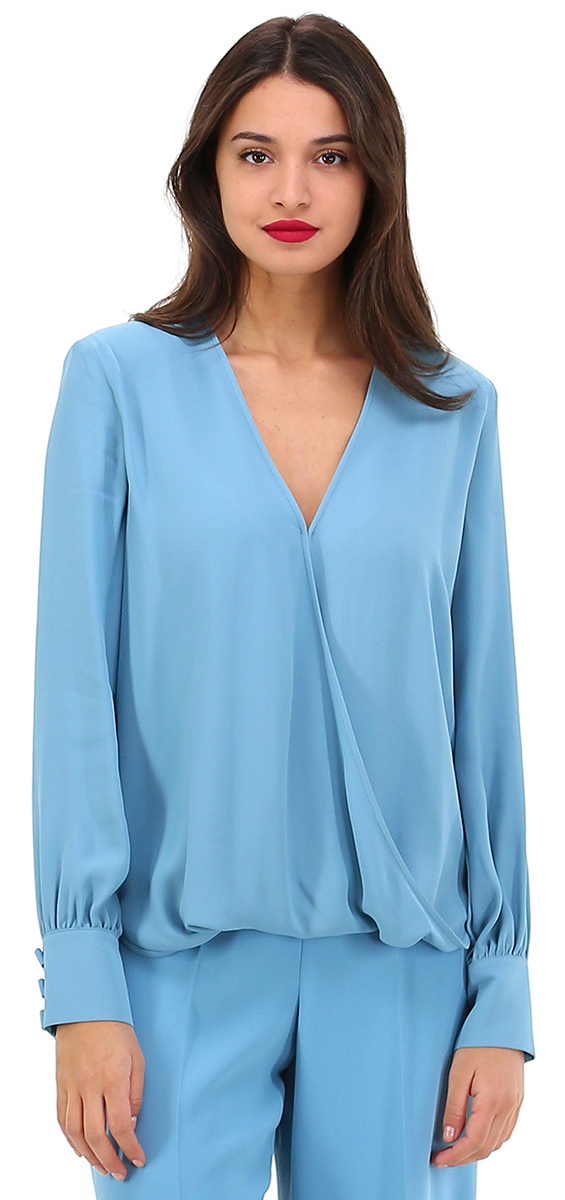 Camicia asimmetrica in cady di viscosa a maniche lunghe con polso alto e fiocchetti. Collo incrociato con gancio di chiusura. La modella è alta 1.80 ed indossa la taglia 42.