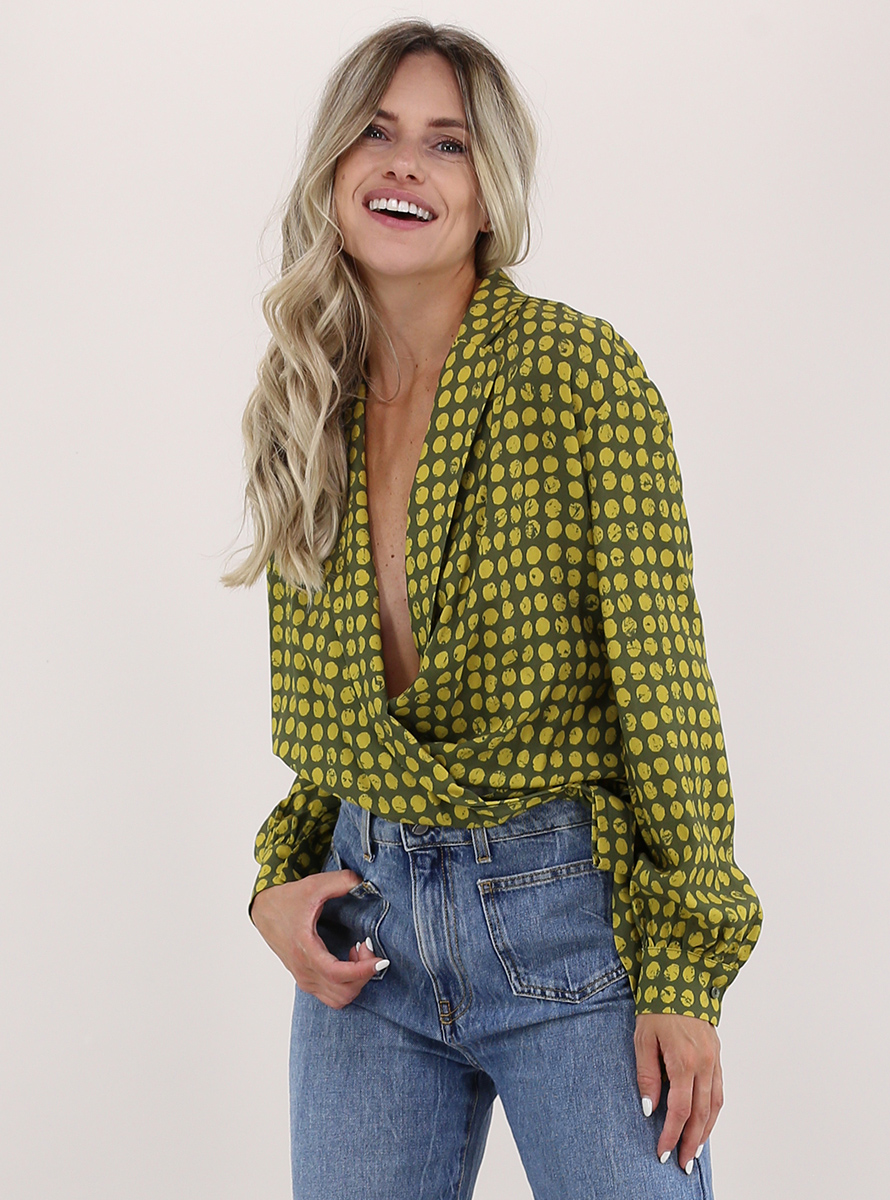 Camicia Manila Grace in viscosa. Maniche lunghe con polsini e scollo a reverse incrociato in vita. Elastico e fiocco di chiusura sul fondo. Fantasia a pois. La modella è alta 1.67 e indossa la taglia 38.