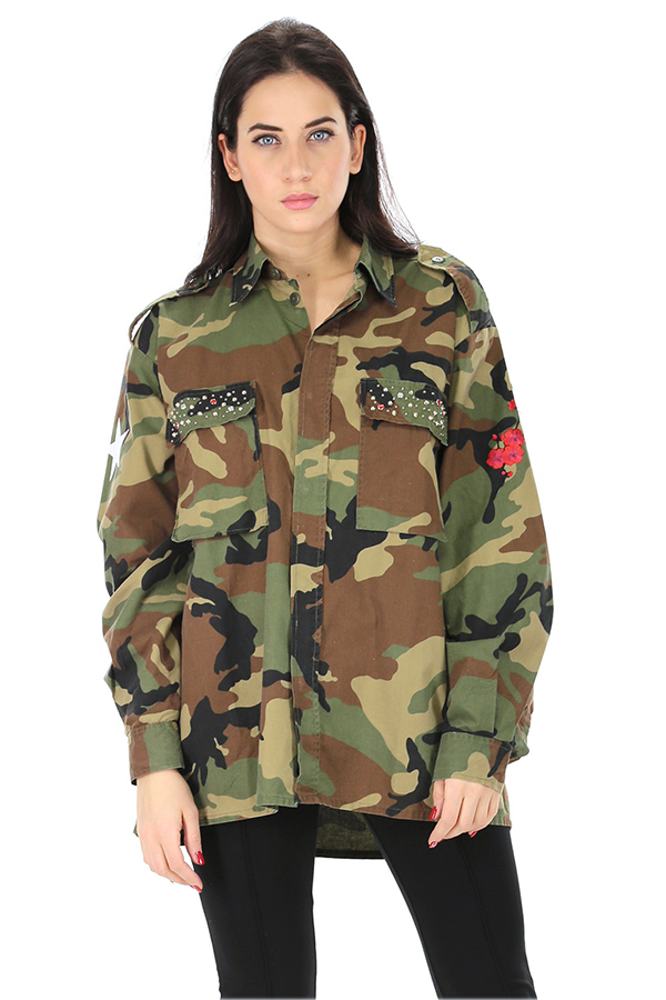 Camicia vintage misto cotone vestibilità oversize con tasche frontali borchiate e stampa sul retro. Tessuto mimetico e dettaglio di ricami floreali sui lati. La modella è alta 1,74 ed indossa la taglia S.
