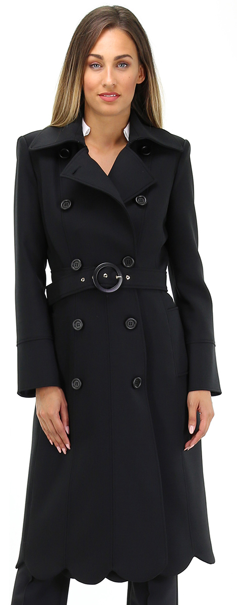 Cappotto foderato a maniche lunghe, collo classico e tasche a filetto laterali. Bottoni di chiusura a doppio petto e cintura inclusa. La modella è alta 1,80 ed indossa la taglia 44.