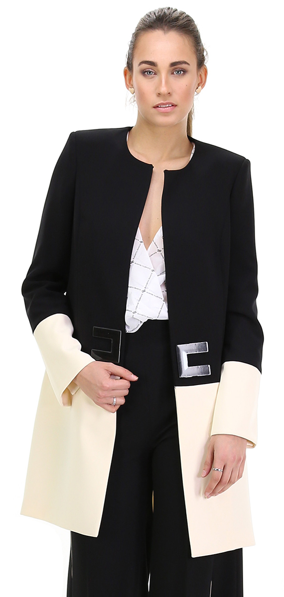 Cappotto bicolor foderato a maniche lunghe e collo a giro. Tasche frontali e ganci di chiusura con applicazione logata. La modella è alta 1.80 ed indossa la taglia 44.