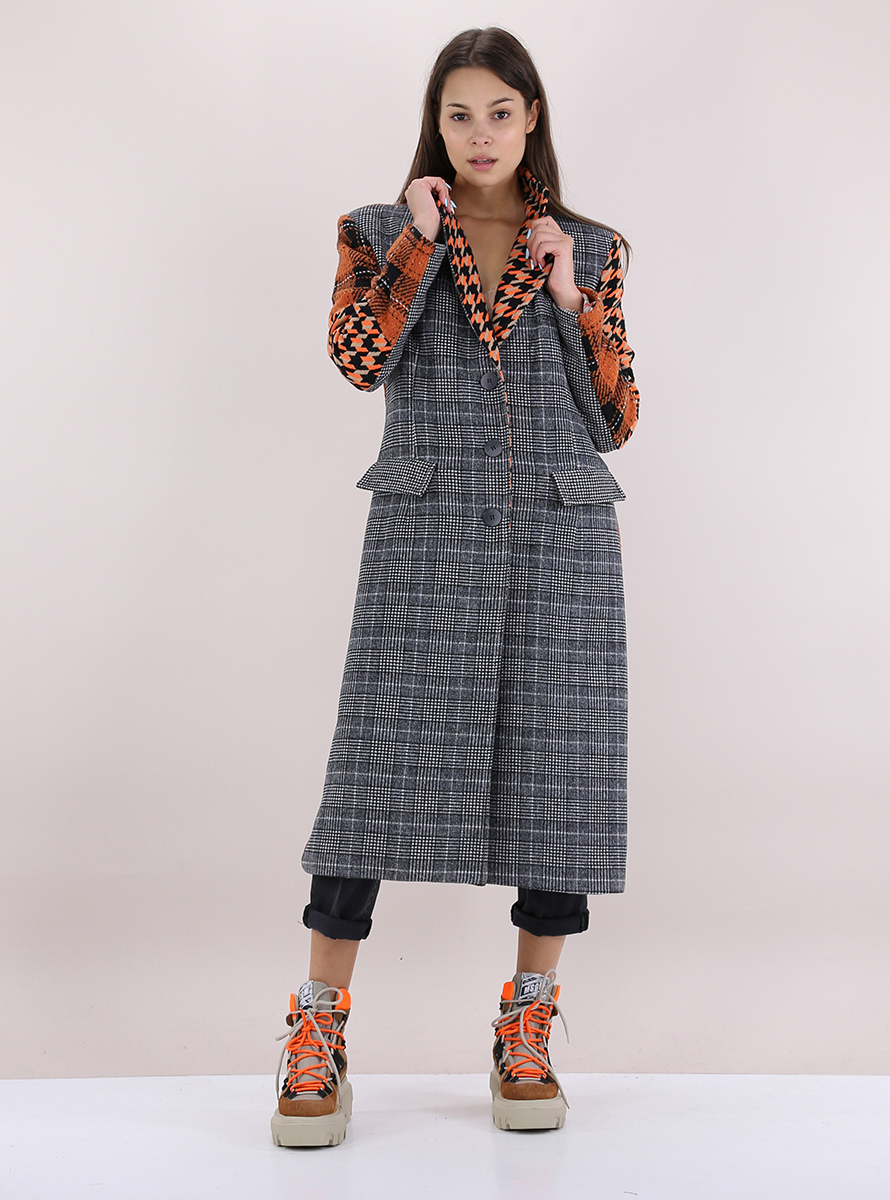 Cappotto patchwork Frivolitè in misto viscosa, cotone e lana foderato. Maniche lunghe e scollo a revers. Tasche con pattine e bottoni di chiusura. Fantasia a quadri multicolor. La modella è alta 1,75 e indossa la taglia 40.