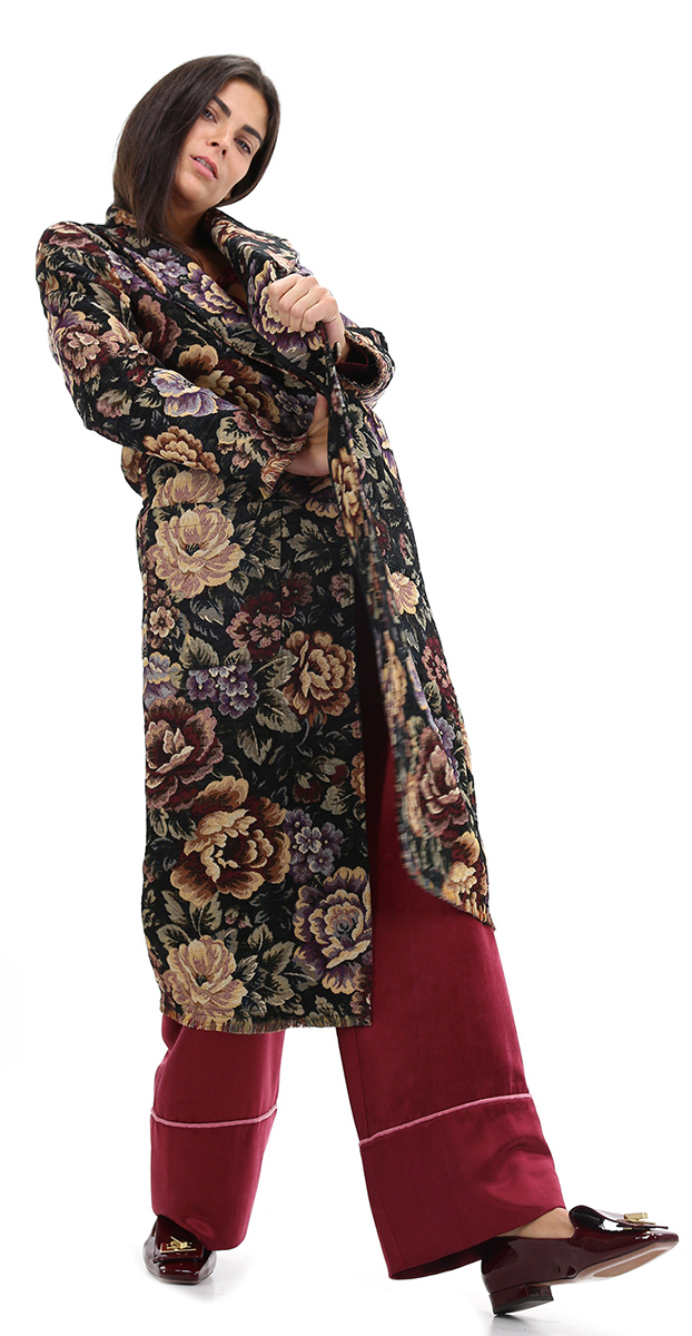 Cappotto in misto cotone a maniche lunghe e collo a scialle. Tasche a toppa e orlo frangiato. Fantasia floreale jaquard. La modella è alta 1,71 ed indossa la taglia 40.