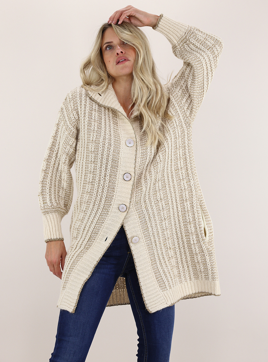 Cappotto in maglia Liu.jo in misto lana e mohair. Maniche lunghe e collo a fascetta. Tasche a sacchetto e bottoni di chiusura frontali ad effetto madreperla. Bordi a polsino con profili gold. Fantasia a trecce bicolor con lurex. La modella è alta 1,68 e indossa la taglia XS.