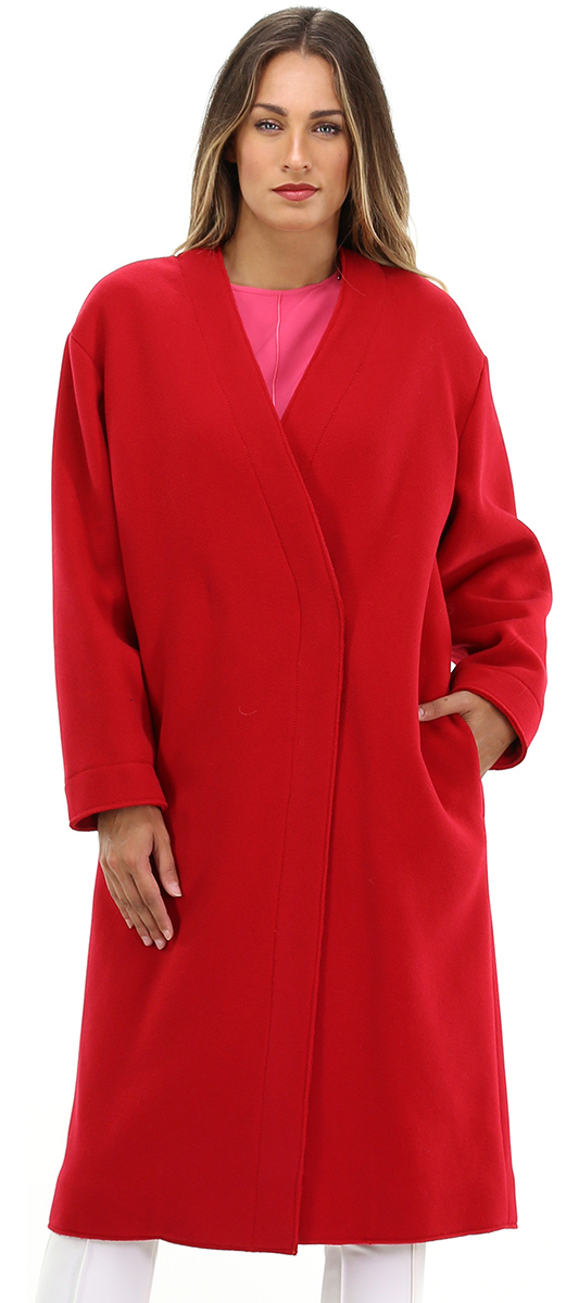 Cappotto in misto lana semifoderato. Manica lunga, spalla scesa e scollo a V. Automatici di chiusura doppi frontali. Fondo a taglio vivo. La modella è alta 1,80 ed indossa la taglia 42.