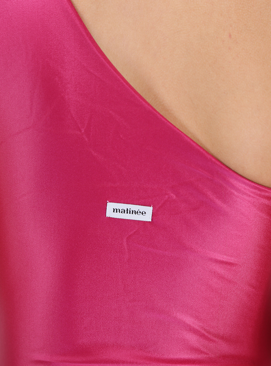 Costume intero Matinèe monospalla in lycra con coppe estraibili. Effetto spalmato. La modella è alta 1.70 ed indossa la taglia M.