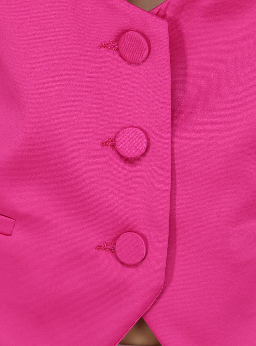 Gilet Aniye By in raso stretch foderato. Scollo a V profondo e tasche a filetto. Bottoni di chiusura in tessuto. La modella è alta 1,75 e indossa la taglia 40.