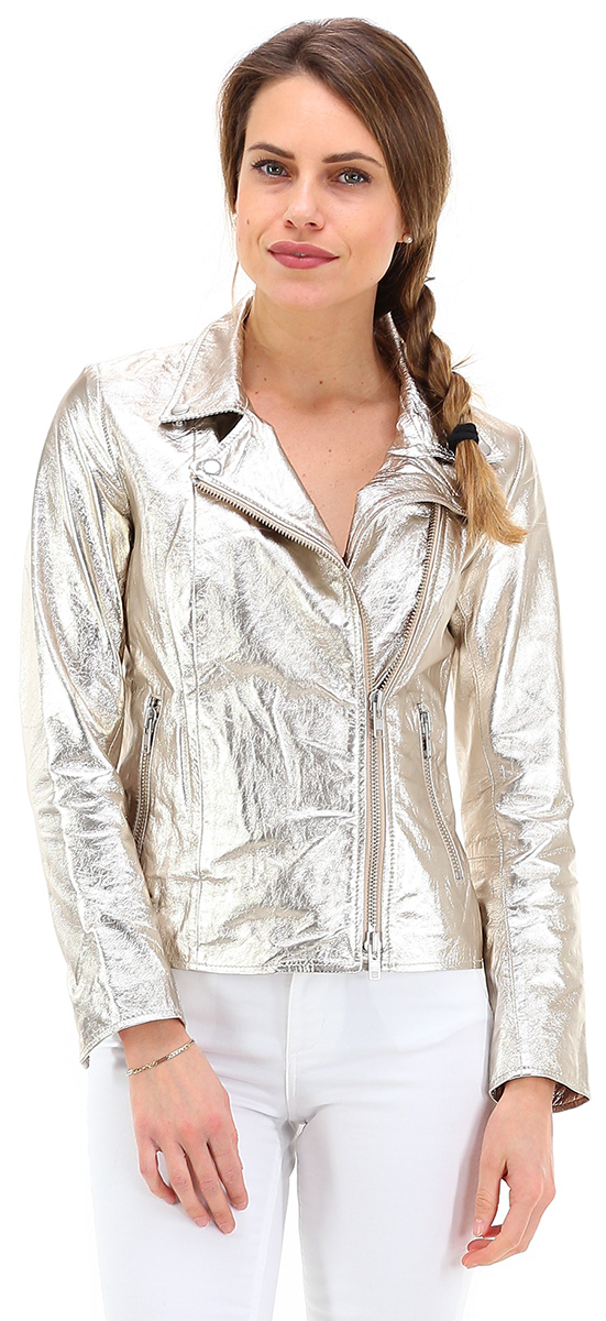Chiodo in vera pelle platino, foderato in fantasia a maniche lunghe. Vestibilità slim. La modella è alta 1,68 ed indossa la taglia 40.