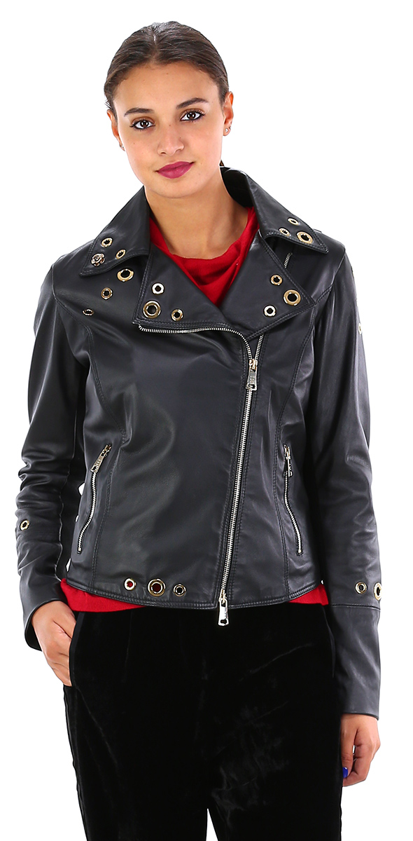 Chiodo in pelle con maniche lunghe con inserto in maglia. Dettagli di oblò gold su collo e fondo. La modella è alta 1.80 ed indossa la taglia 40.