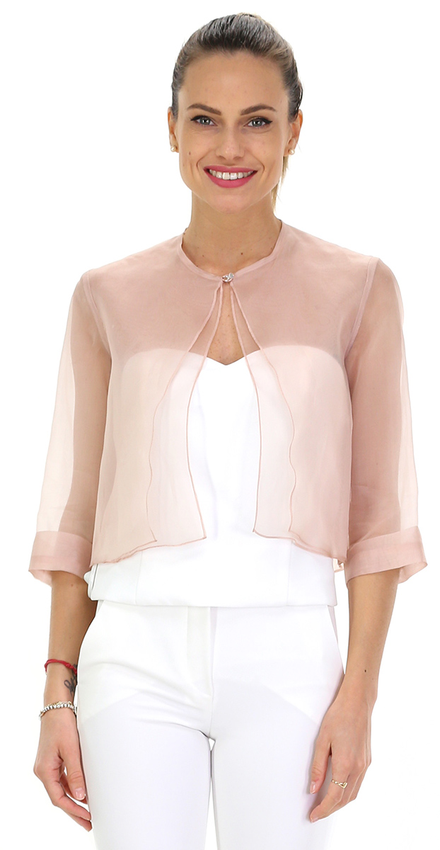 Coprispalle in organza di seta con maniche a tre quarti. Collo a giro con bottone di chiusura frontale. Corpetto doppio. La modella è alta 1.80 ed indossa la taglia 42.
