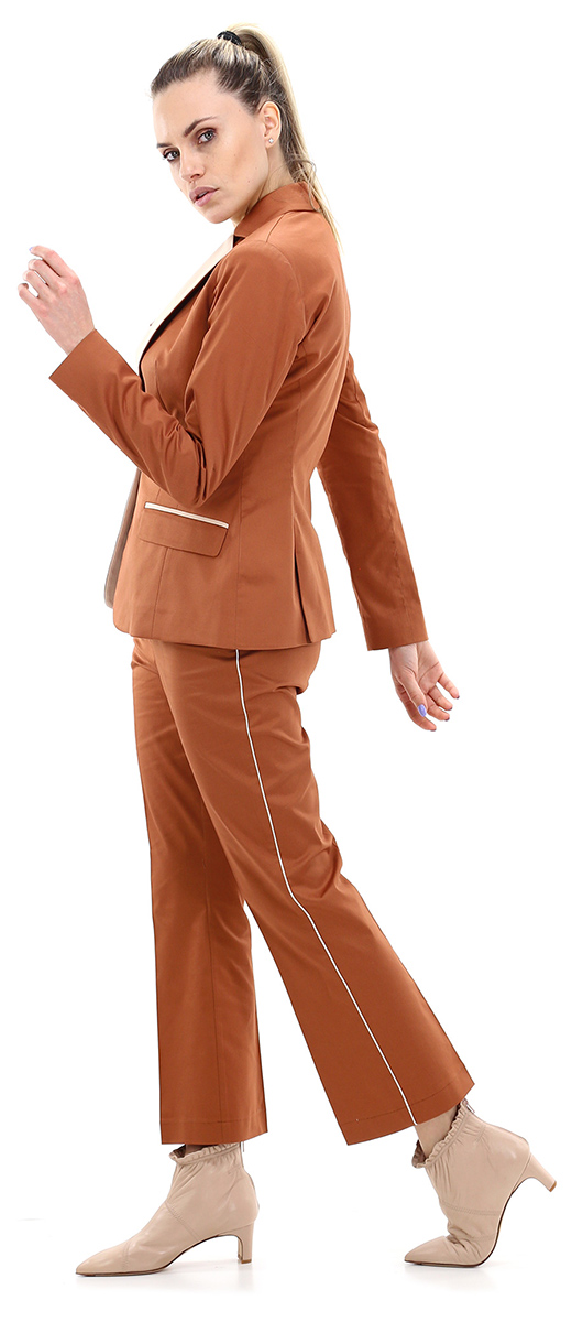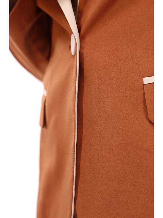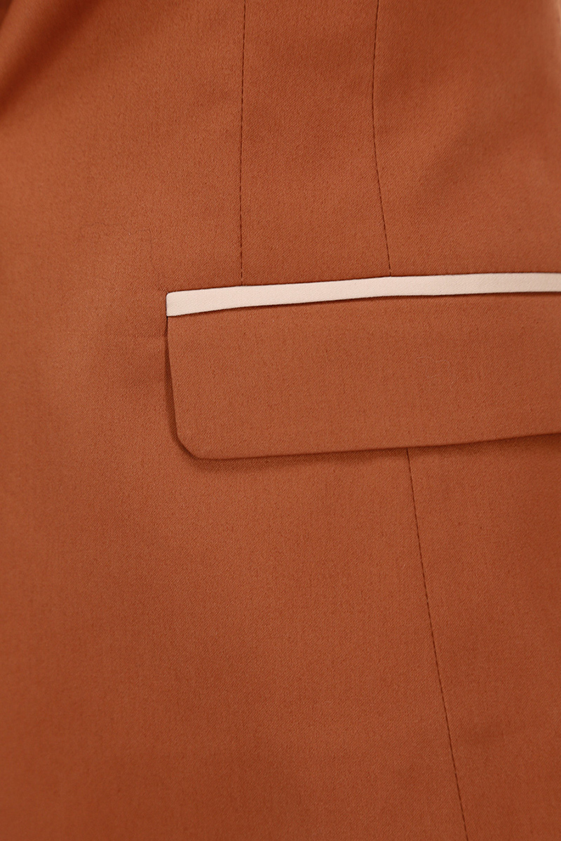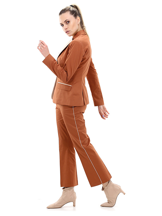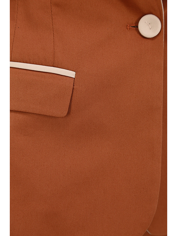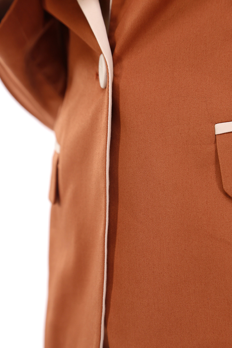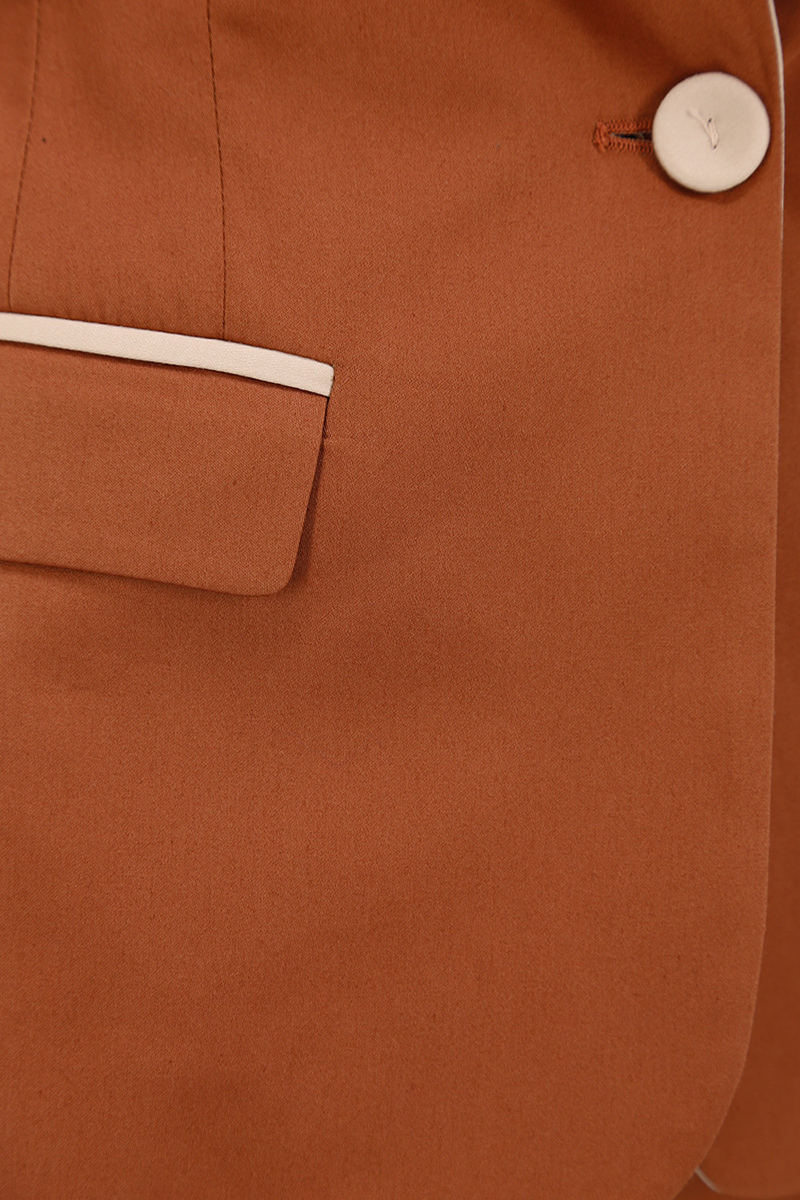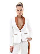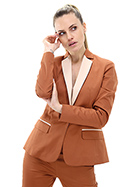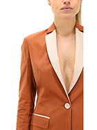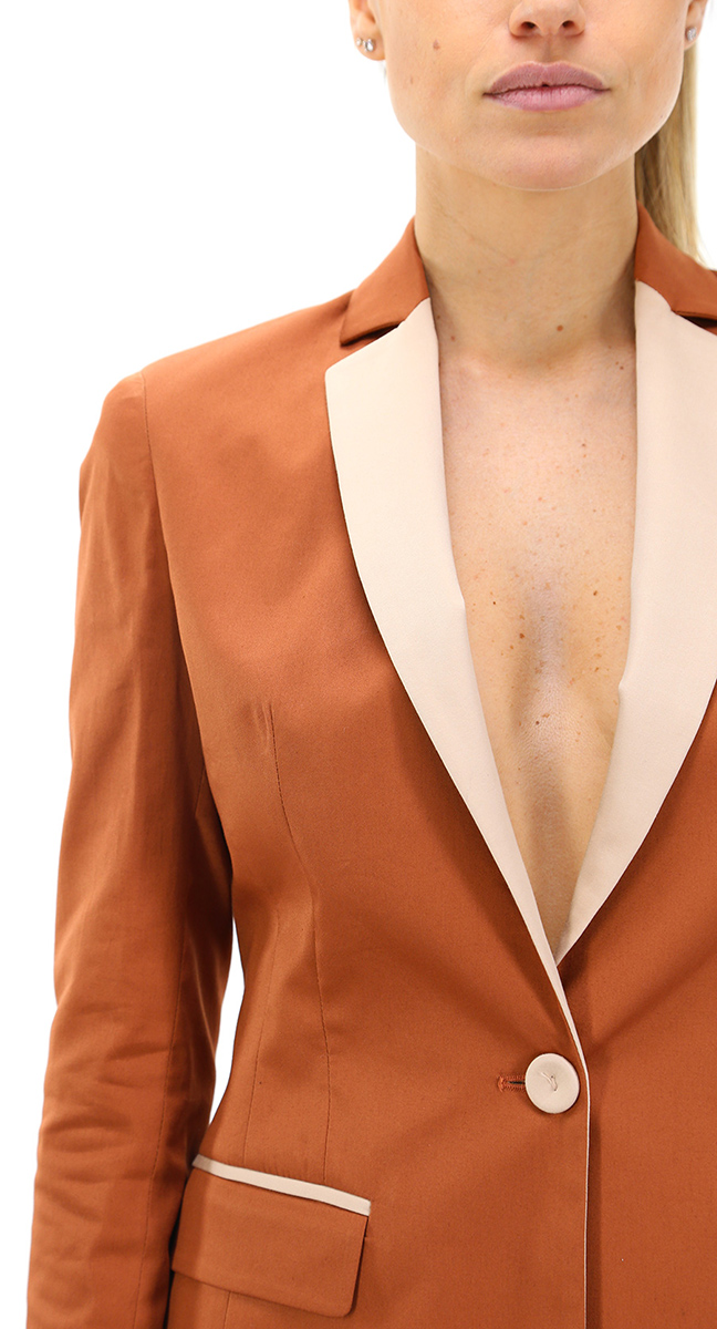 Blazer in cotone ed elastane foderato a maniche lunghe e collo a reverse a contrasto. Tasche con pattina e spacchi sul retro. Botte di chiusura. La modella è alta 1,68 cm ed indossa la taglia 38.