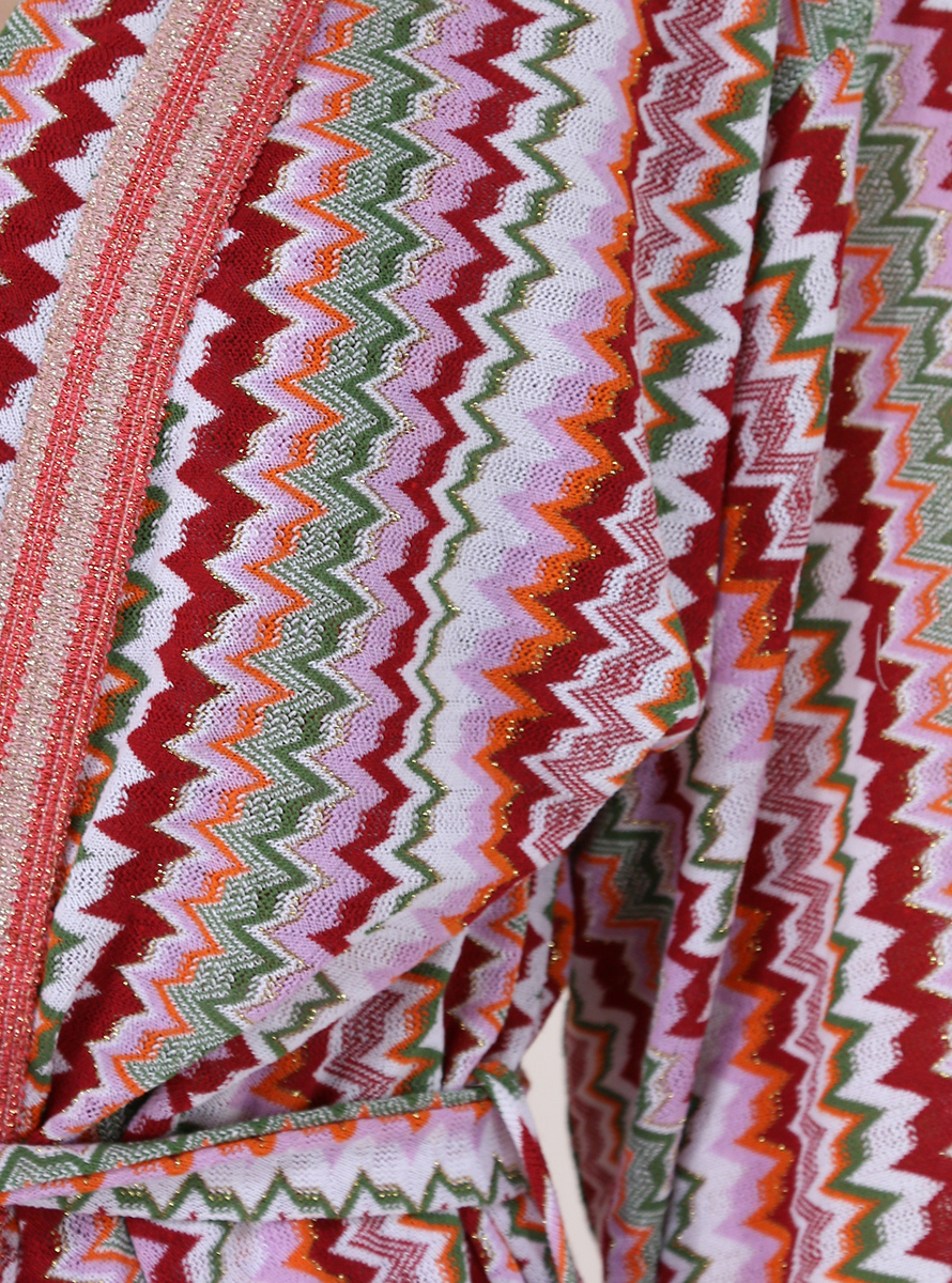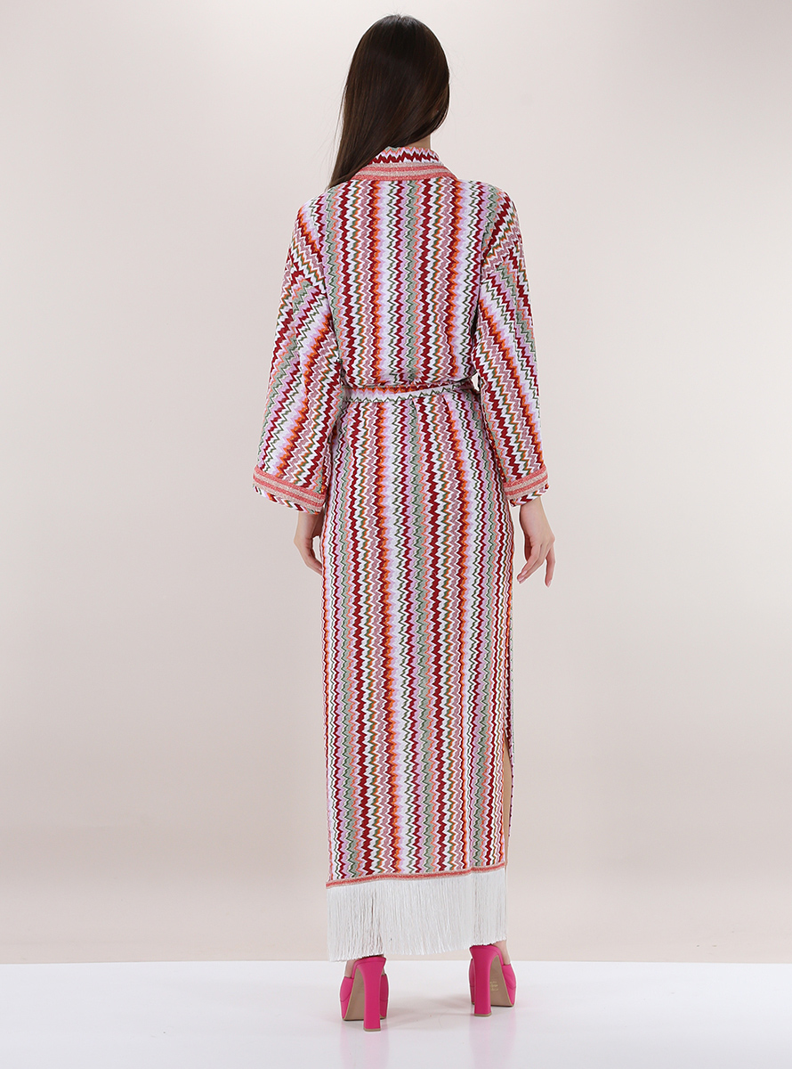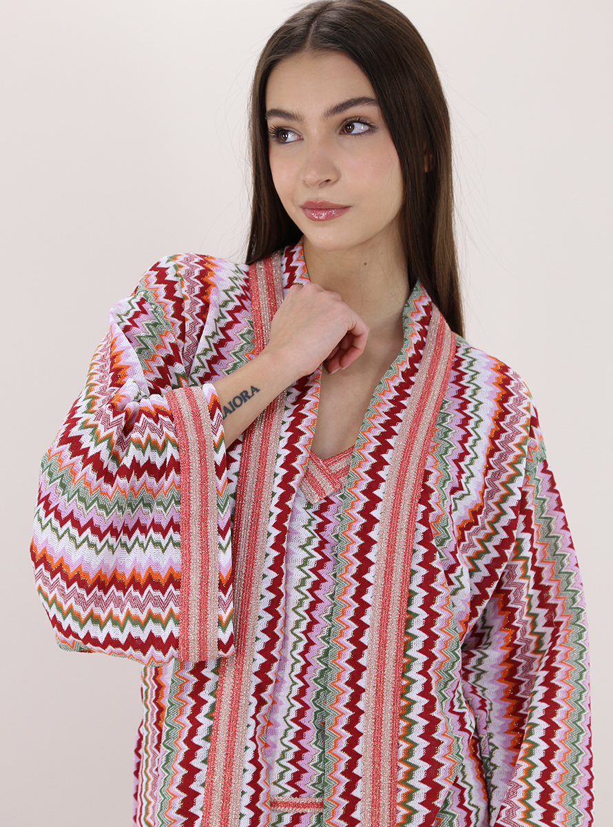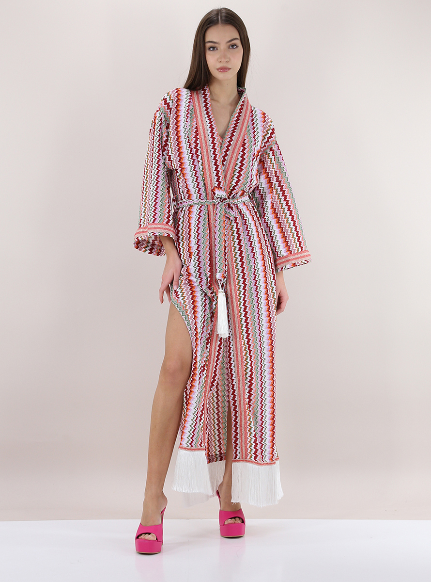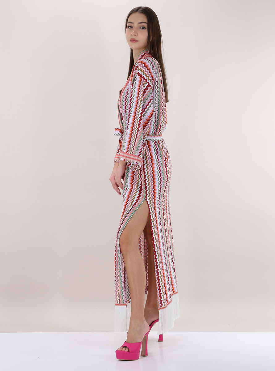 • Applicazioni: Fantasia, Inserti in lurex, Applicazioni a contrasto, Fondo con spacchi laterali, Fondo sfrangiato