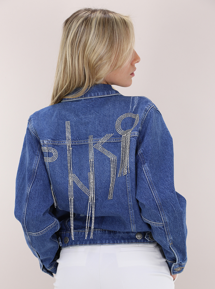 Giubbino Pinko in denim di cotone a maniche lunghe. Abrasioni e ricamo logato in strass sul retro. La modella è alta 1,70 ed indossa la taglia 38.