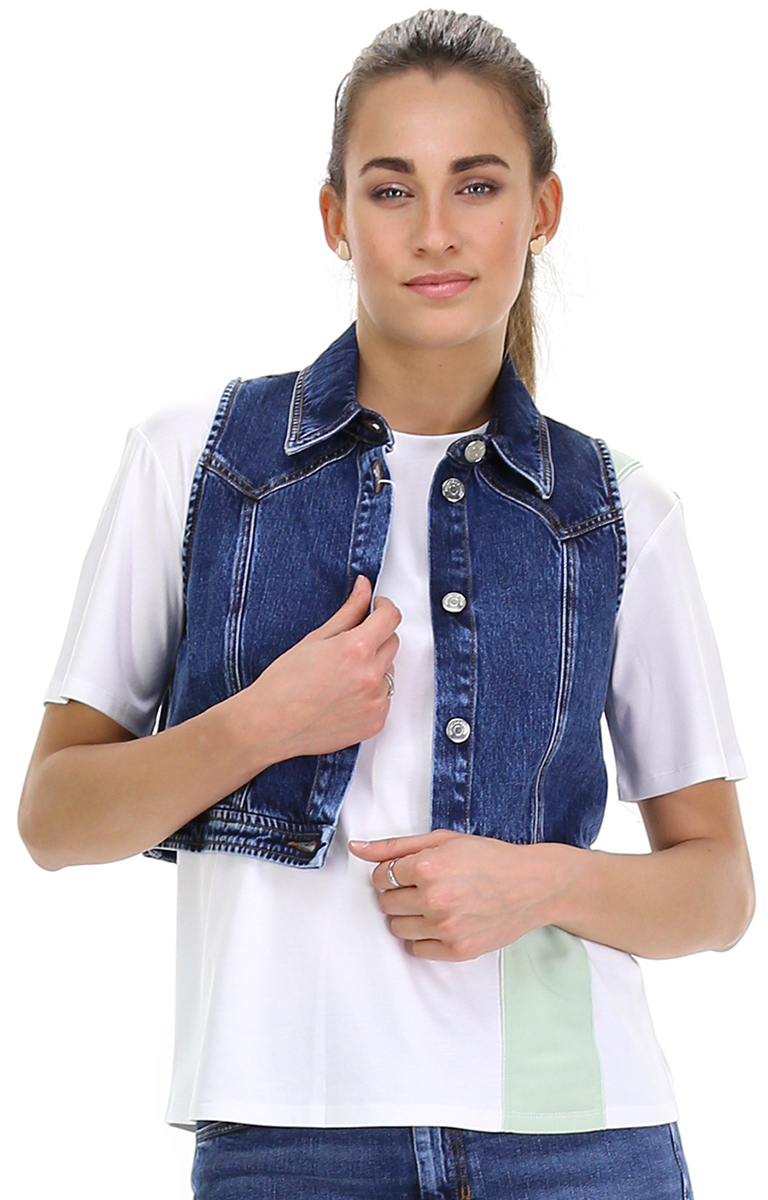 Gilet in jeans, collo classico e arricciatura con carrè sul retro. La modella è alta 1.80 ed indossa la taglia 44.